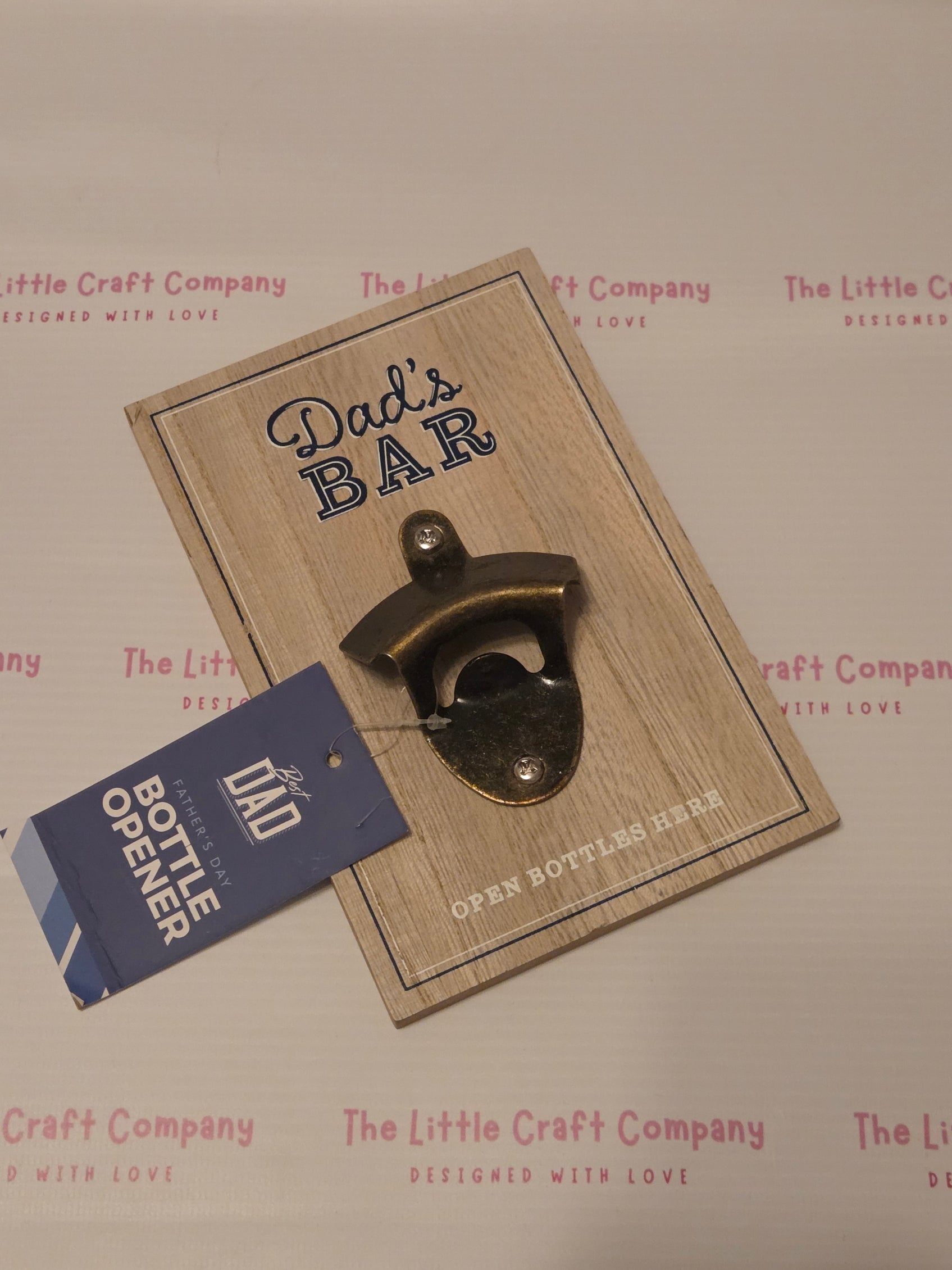 This wooden wall-mounted bottle opener features a stylish “Dad’s Bar” design and a sturdy metal opener—perfect for creating his own little bar space at home.