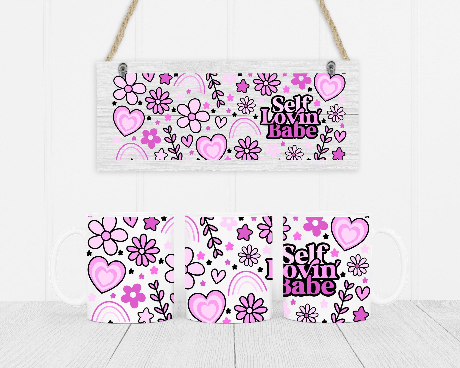 Featuring bold pink lettering surrounded by cute hearts, flowers and rainbows, this design is all about confidence, self-love and good vibes.